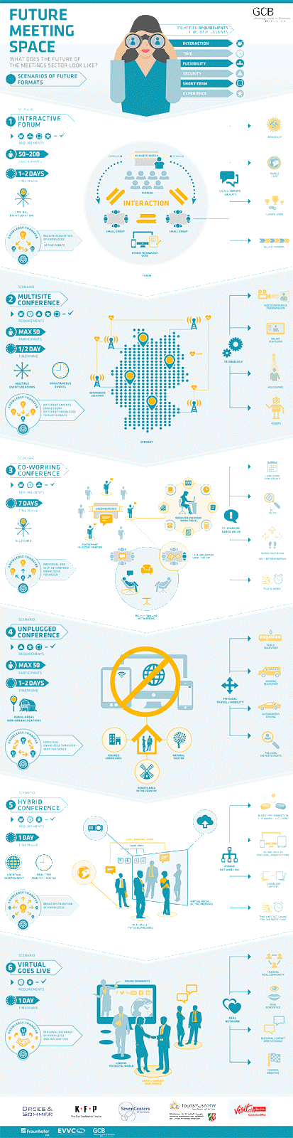 German Conventions Bureau недавно сделало обзор об основных трендах в проведении деловых мероприятий. Мы уже недавно касались этой темы в обзоре Важных трендов в event-маркетинге, но здесь речь идет о возможных новых форматах встреч, которые будут развиваться в деловом мире в ближайшее время.