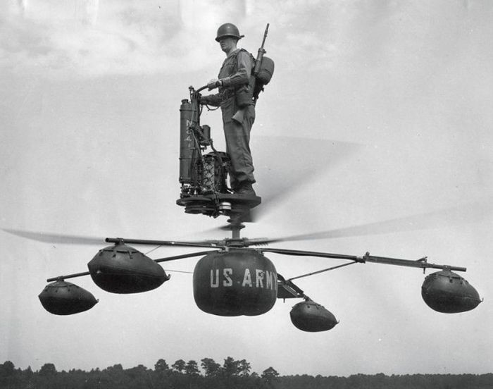Экспериментальный аэроцикл Де Лайнера (De Lackner HZ-1) в Форте Юстас, Виргиния США, 1956 год. Эта машина не была принята на вооружение армии по причине их не безопасности для пилота.