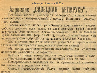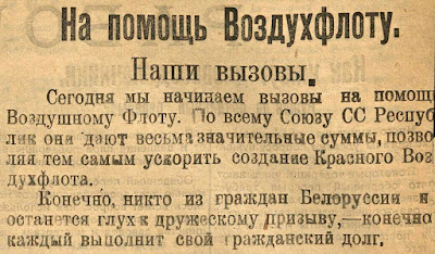 9 марта 1923 года в белорусских газетах появилось объявление: «Совецкая Белорусь» открыла кампанию по сбору пожертвований в пользу Красного воздушного флота.
