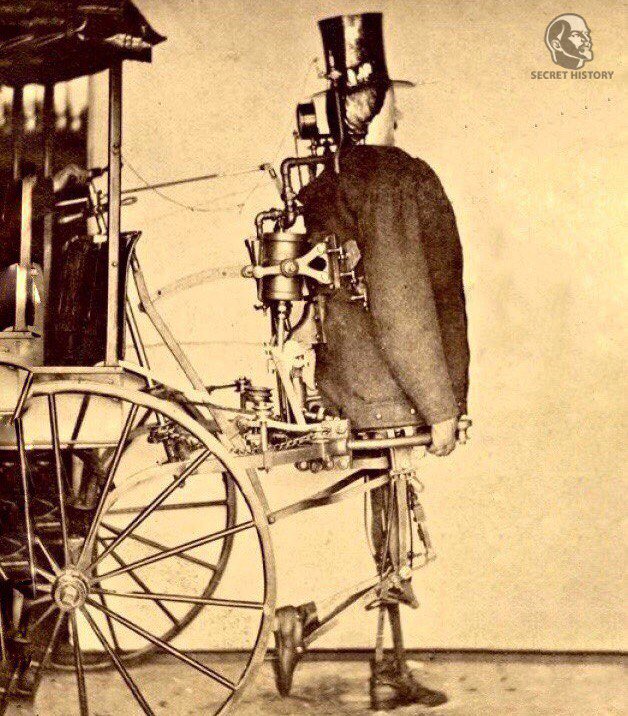 В ранце на спине у него были клапаны, а на шее — вожжи, с помощью которых водитель управлял Паровым Человеком. При благоприятных обстоятельствах Паровой Человек был способен развивать очень высокую скорость.
