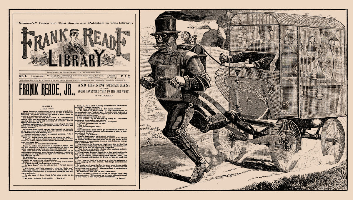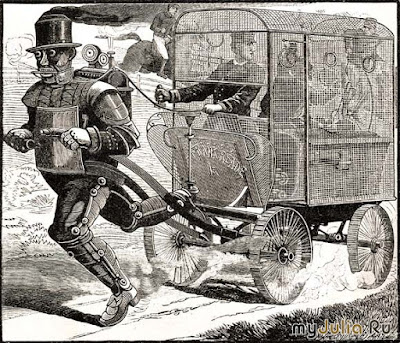 В носу у него было приспособление, подобное свистку паровоза, через которое выходил пар. Там, где у человека находится грудь, у него был паровой котел с дверцей для подбрасывания поленьев.